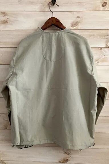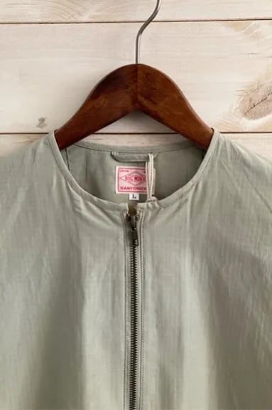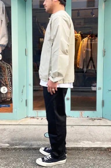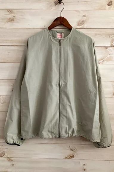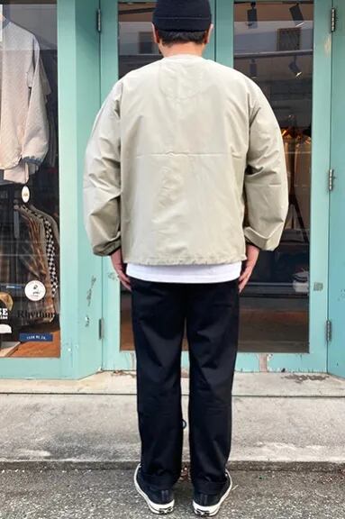 BIGMIKEからNO COLLARE FULL ZIP JACKETが入荷しました。コットン 68%、ナイロン 32%のコットンナイロンのリップストップ生地は強度があり、程よい厚みで春や秋のライトアウターに丁度いいアイテムとなっています。袖口はパイピングがまわり、裾にはドローコードが付いています。ノーカラーのジャケットなので、ロンTやパーカーなど様々なアイテムとレイヤードスタイルでお使いただけます。