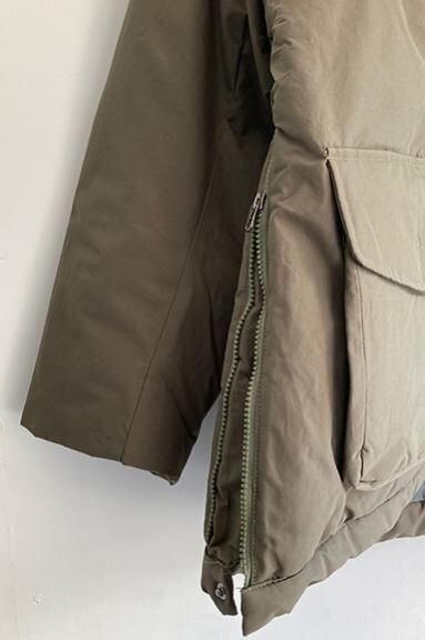 オーバージャケットということでゆとりのあるフィット感で、細かいディティールは、より街着として着易くアレンジしています。裾についたドローコードをギュッと締めるとバルーンシルエットとなり、綺麗なの丸みを生み出してくれます。脇のジップをガバッと開くと、Aラインのシルエットになり、パンツポケットへの手の出し入れもし易くなります。一つのアウターで色々なスタイルチェンジを生むアウターです。