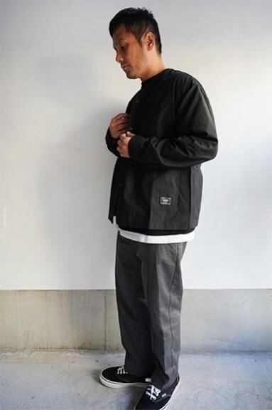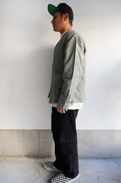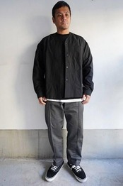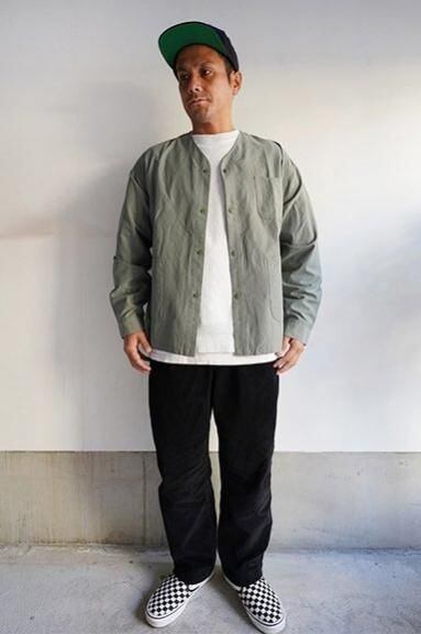 エンジニアジャケットをベースに落ち着いた首元の開き、3本張りのステッチ、オリジナル刻印入りのボタン、フロント3つポケット、袖口はボタンで開閉可能。シンプルながら実用性の高いディティールです。少しハリのあるドライなタッチが特徴の清涼感のあるコットンナイロンになり、ライトアウターとしての着こなしとカーディガンのようにインナーとしてのレイヤードも楽しめます。
