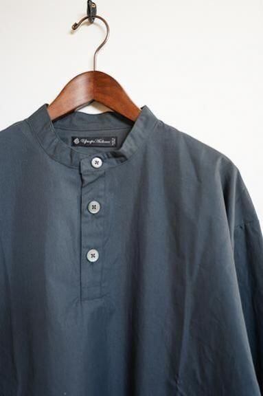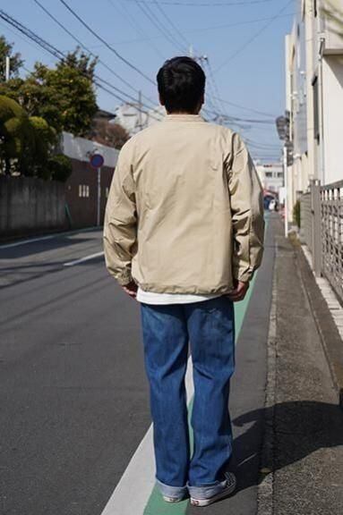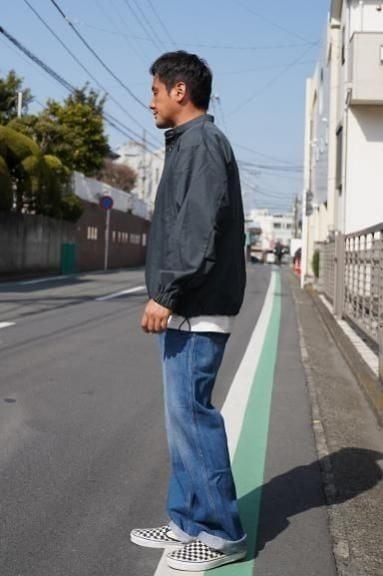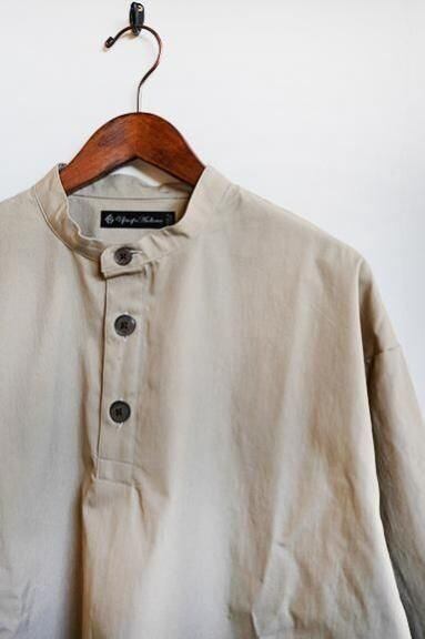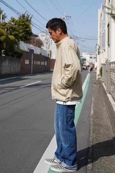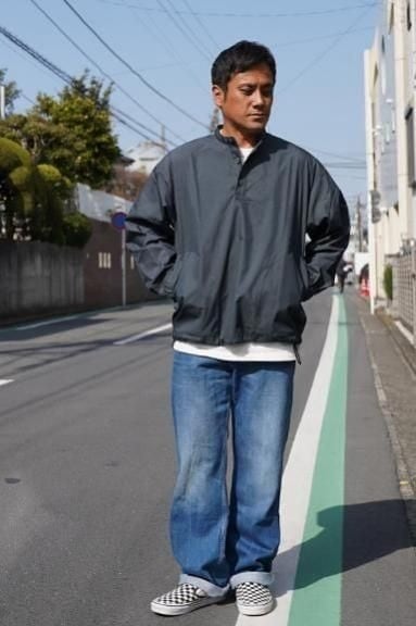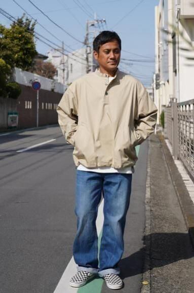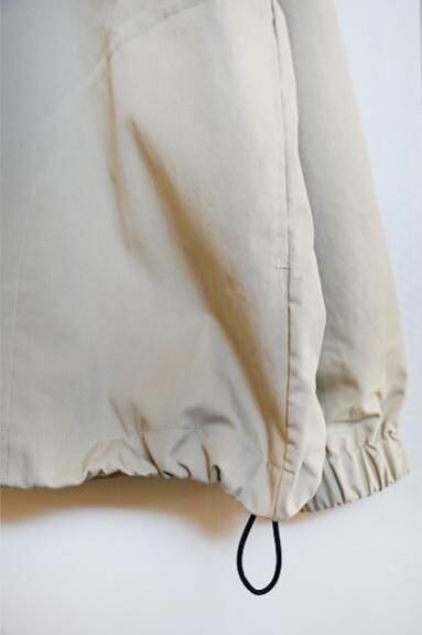 綿70%、ナイロン30%の程よくハリのあるしっかりとした素材で作られたプルオーバータイプのライトアウターです。首元はベーシックなスタンドカラーで、全体のシルエットはライトアウターらしい肩幅と身幅にゆとりのあるリラックスシルエットとなっています。プルオーバーながらフロントのボタン部分がしっかりと開き、ゆとりのあるシルエットの為、脱ぎ着も余裕です。全体を覆いこむようなふくらみのあるシルエット、裾に配されたドローコードが一味も二味もアクセントを効かせてくれます。様々なスタイルに取り入れていただける一枚となっています。