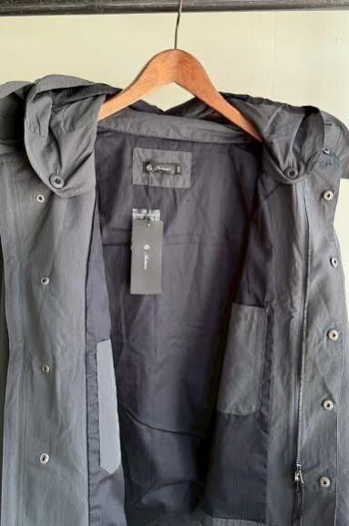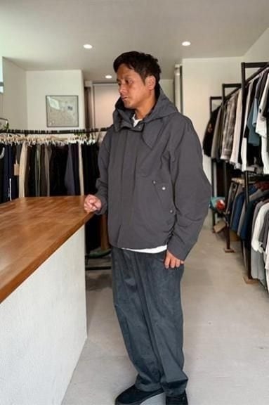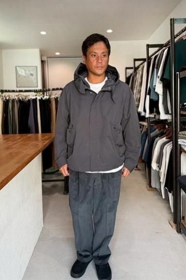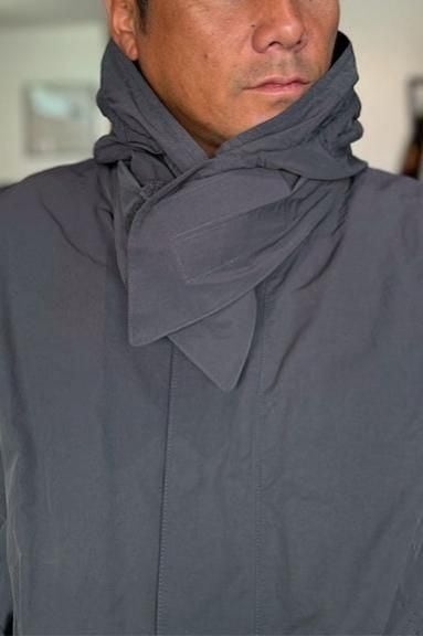着丈を潔く短くし、ややゆったりとしたボックスシルエットで、今のスタイリングに合わせやすく仕上げています。ショートタイプの特長は、裾に配置されたスピンドル。お好みの加減でしぼりを調整することで、スタイリングのアクセントとして機能します。フードは脱着式になっているので、スタンドカラーのライトアウターとしても着用可能です。現在、ヴィンテージ市場では流通することが少ない、オリジナルに近いコットンナイロンのポプリン素材を採用しています。