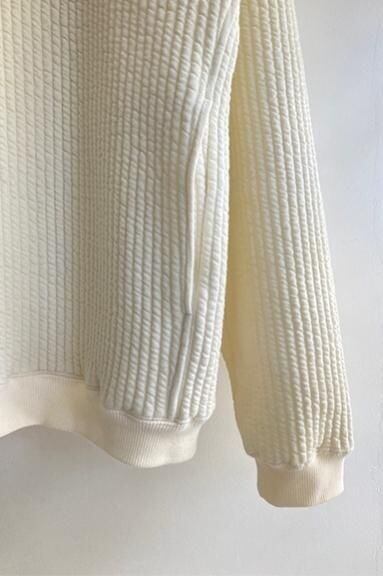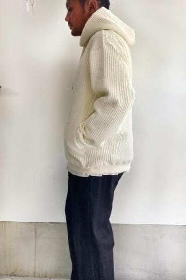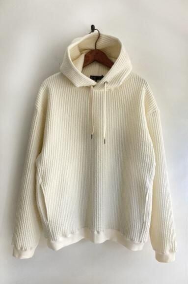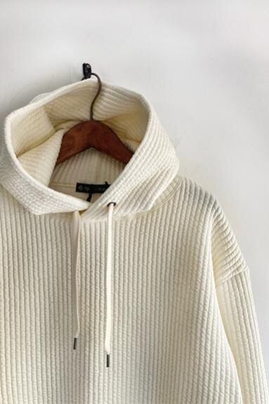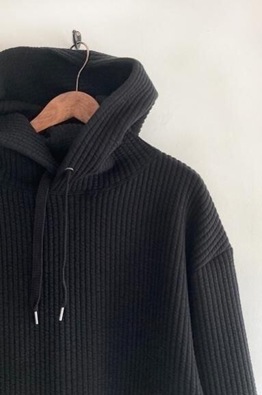 Audience人気素材の一つ【コットンキルトシリーズ】裾と袖口にリブを配し、よりスウェットライクな仕上がりになっております。表面はふっくらとしたソフトな弾力があり、ゴムのようなストレッチを兼ね備えストレスフリーな着用感も大きな魅力です。ドロップショルダーにボックスシルエット。リラックスしたシルエットが今作のポイント。身生地を2重にしたフードは、合わせを深く設定することでフードの立ち上がりをキープしてくれます。人気素材になりましたこちらのコットンキルト、コットン100%の生地を2枚重ねで、間に中綿を入れてつくった生地は世界的に有名な生地産地である愛知県の「尾州産」です。細かなニットの網目を立体的に表現し暖かみのある生地に仕上がっています。程よい厚みで暖かく、また伸縮性のある生地なので動きやすさも兼ね備えております。縦に縫われて接結されたキルトは、ストライプ柄のような表情。ご家庭の洗濯機で気軽に洗えるのも嬉しいポイントです。