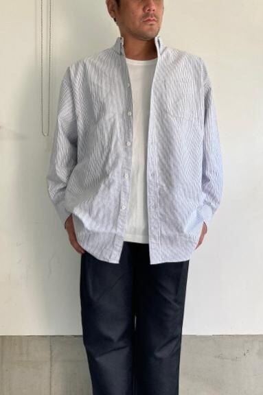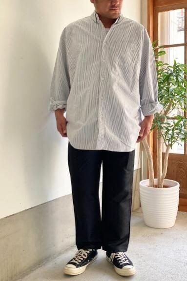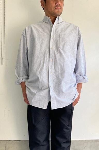 Audienceから播州織オックスフォードストライプ ボタンダウン 長袖 ボクシーシャツが入荷です。90年代生産されていたRalph Lauren(ラルフローレン)の名品「BIG SHIRTS(ビックシャツ)」をモデリングして、一からパターン作成した新しいご提案です。大体のサイズ感は、MサイズでレギュラーサイズのXLサイズぐらいの大きさになります。レギュラーサイズのXLサイズを着ると袖丈や着丈が異常に長くなってしまい、どうしても野暮ったくなりがちですが、こちらのモデルはAラインのBOXシルエットを重点に、大人の方でも品良く着用できるよう計算されたサイズバランスになっています。