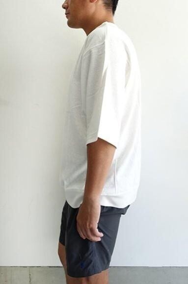 着用シルエットは着丈は通常サイズながら身幅にゆとりを持たせたリラックスシルエットです。スウェットのディテールを落とし込んだスウェットライクなTシャツ。おすすめです。