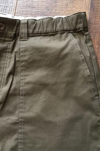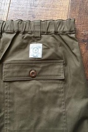 伸縮性のある糸(ポリウレタン)を混紡する事により、ストレッチの効いた生地になり、快適な着心地となっています。「ベイカーパンツ」とは、前と後ろに四角く大きなパッチポケットが施され、さらに後ろポケットにはフラップがあるのが特徴です。