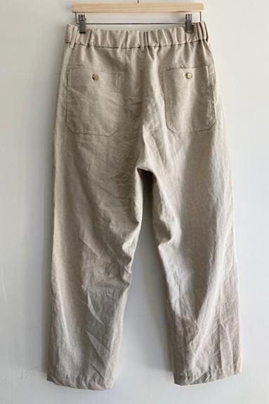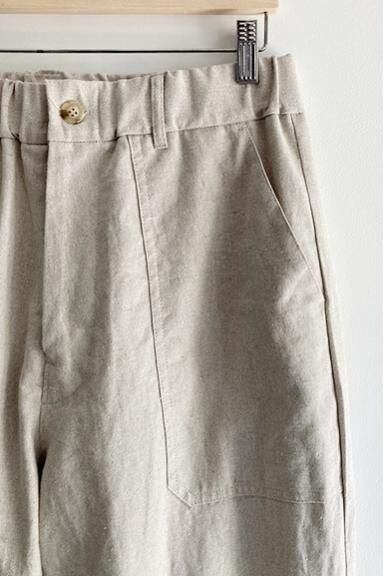 ウエストの仕様は平ゴム入りの調整可能なスピンドルを配しております。ウエスト紐は内側の見えない仕様です。ベルトループもあり、シーンに合わせた着用を可能としてくれます。ビンテージ感漂うコットンリネン素材で春夏コーデにおススメの1本となっています。</p>