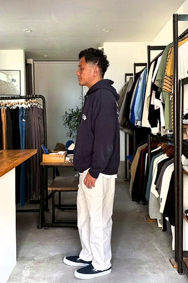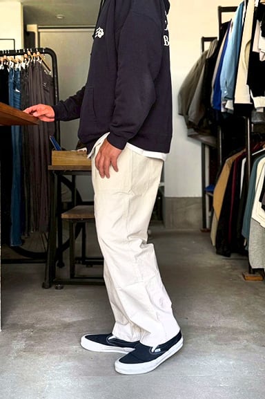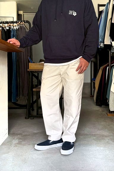 見た目はヴィンテージのワークパンツのような表情を持ちながら、穿き心地は驚くほどストレスフリー。汗ばむ季節でも肌に張り付かず、ドライな質感を保つ、日本の夏に最適なアメカジパンツです。