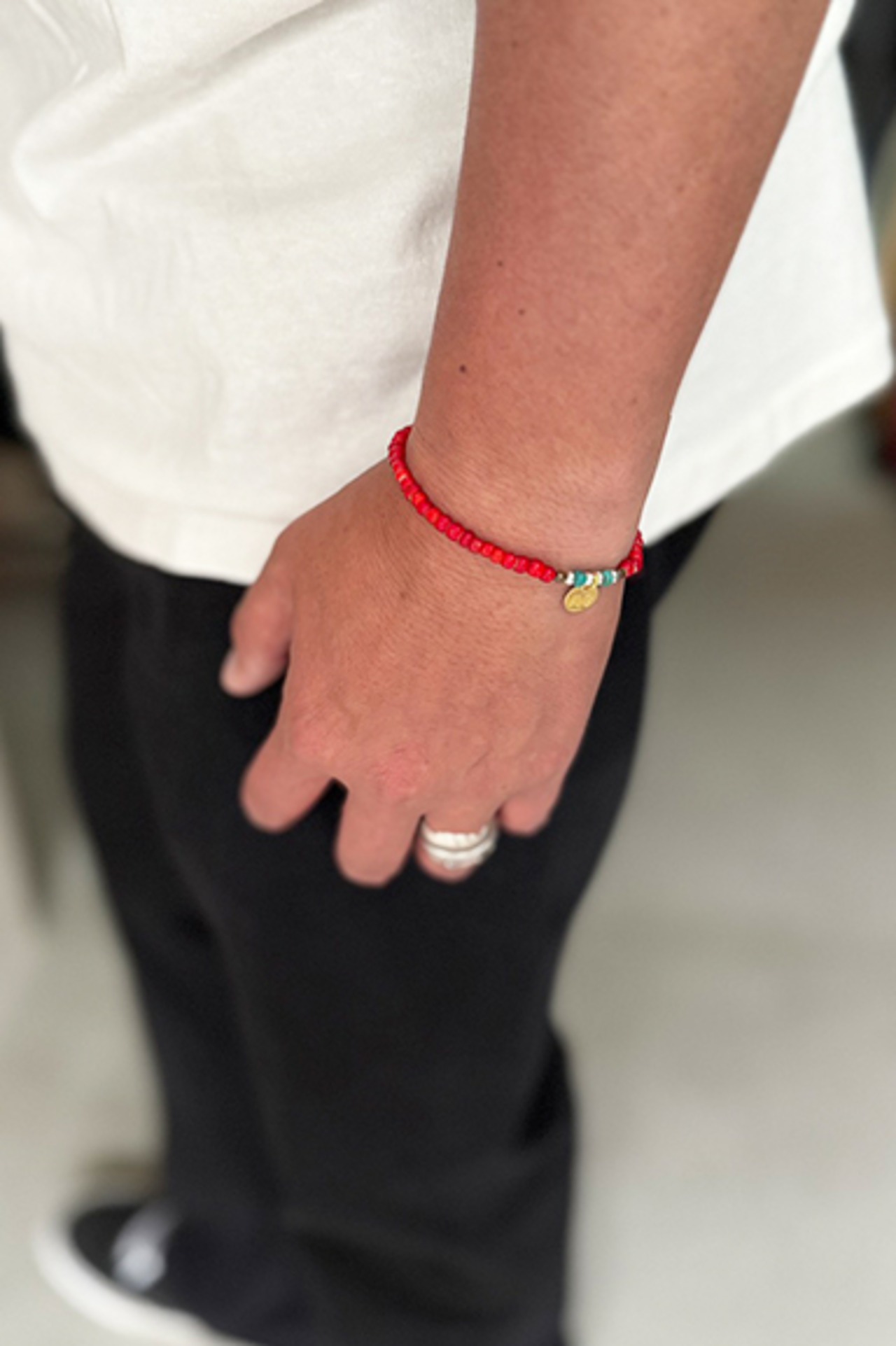 ビーズの色味や組み合わせは主張しすぎず、Tシャツやシャツ、サンダルスタイルにもすっと溶け込むバランスに。