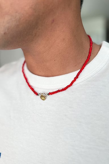 ビーズの色味や組み合わせは主張しすぎず、Tシャツやシャツ、サンダルスタイルにもすっと溶け込むバランスに。