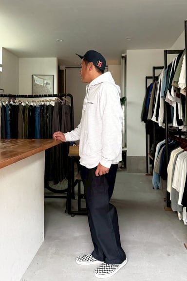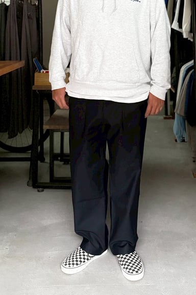 一見、ルーズ目なシルエットは裾にかけてのカットが秀逸で、ジャストで履くのは勿論、オーバーサイズをウエストで絞って履く事により、よりワイドなシルエットをお楽しみ頂けます。