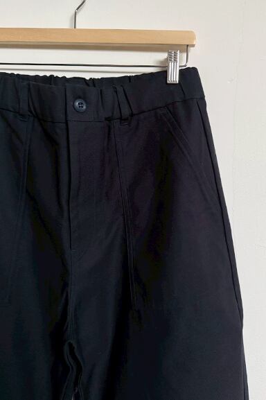 フロント両サイドの大型のパッチポケットとヒップ両サイドのフラップ付きパッチポケットのシンプルなベイカーパンツに、凹凸が横シマのようじ現れるバックサテン生地を採用。